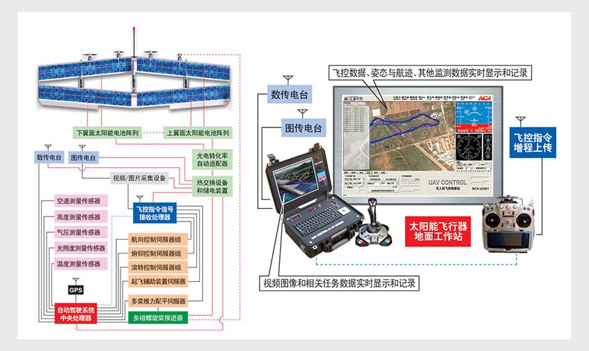太阳能飞行器是非常复杂的当代科学技术集成体,它不仅像常规飞行器一样,需要解决材料与结构、重量与可靠性、气动和控制等方面的诸多问题,还需要解决目标指向高空应用的太阳能电池、螺旋桨推进系统、热交换和能量储存与循环装置、以及各种测量传感系统等相关技术难题。